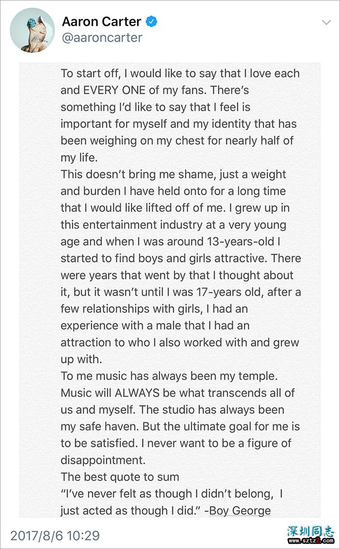 29岁的亚伦是“后街男孩”演唱组成员尼克·卡特(Nick Carter)的弟弟,年纪很小就发行了唱片,曾被誉为“流行乐小王子”。他在6日发布的推文中提及自己在娱乐工业中长大,然后写道:“大约13岁的时候,我发现男孩和女孩都可以吸引我。”