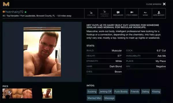 于是他点进去了主页看,原来害羞的博士用了化名“hotnhairy72”来称呼自己,同时在兴趣那一栏还包括“约会”、“接吻”、“已婚男人”、“按摩”等等标签来寻找同性伙伴。
