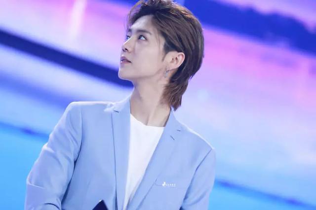 跟鹿晗以往的风格很不一样,穿着蓝色西装+复古鲻鱼头的鹿晗有点日系风;