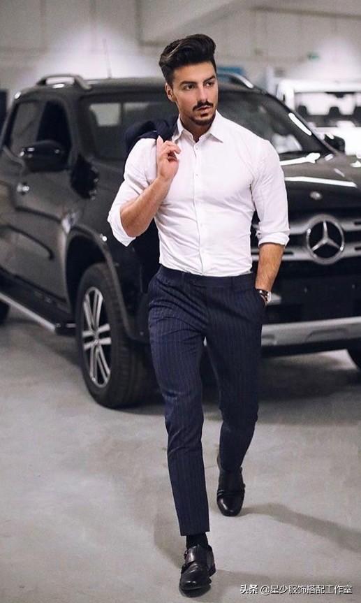 第二种,与衬衫搭配的裤子不平凡!同样从构成裤子的三个元素来看!不够,对于面料与款式而言,在裤子上的差异并不明显,所以重点在于色彩!抛开黑白,还有蓝色,驼色,咖啡色可供选择!