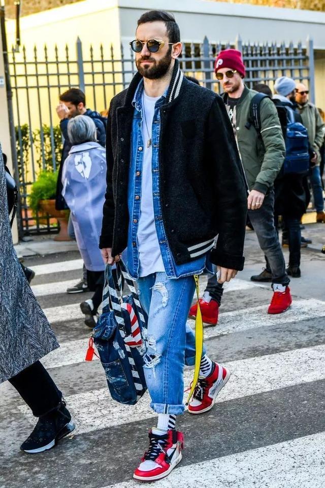 在黑色调的造型中搭配一件蓝色的牛仔夹克,造型的视觉冲击力就变得更强,加上一双运动鞋造型的街头时髦感就更突出。