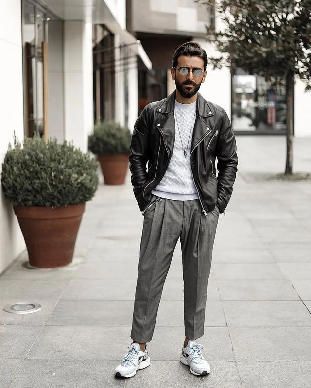 西裤搭配皮夹克和运动鞋的造型也能打造出沉稳的风调,一条合身的九分西裤加上短款版型的夹克,让造型的视觉比例也变得更加出众,黑白的色调让造型显得时髦大气。