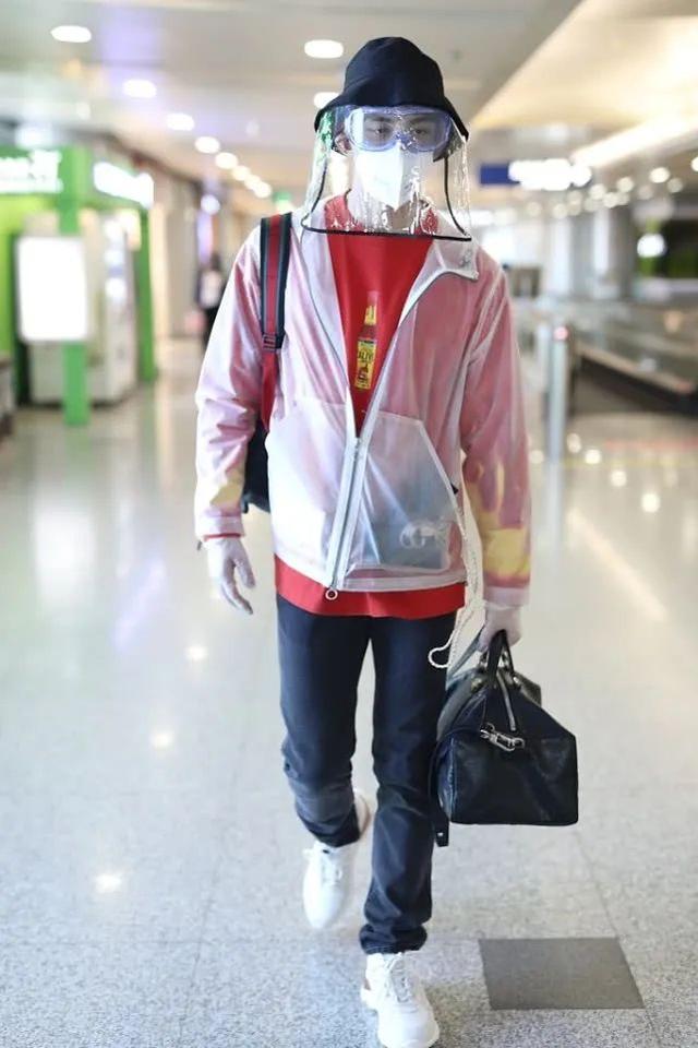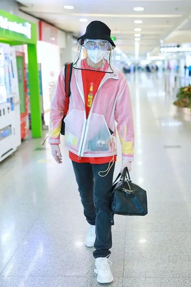PVC的防护口罩加上渔夫帽,造型就显得很出众,加上一件PVC材质的外套,造型就显得非常的完美。吴磊的造型也算是一举两得,在做好防护工作的同时,也把造型穿出时髦的格调。